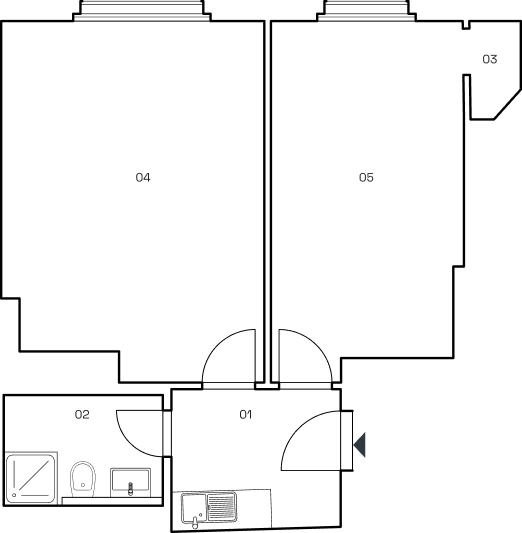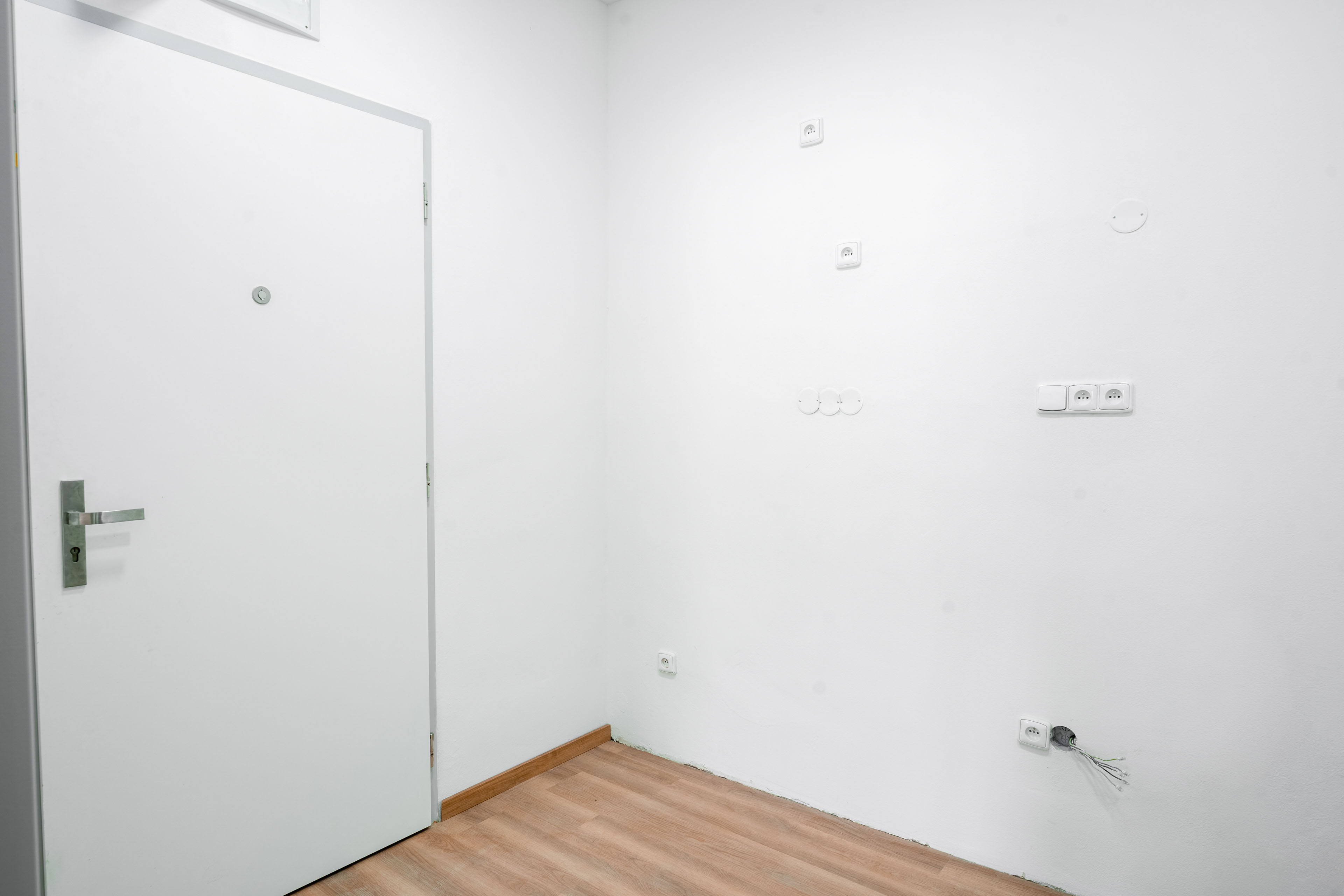 Byt se skládá ze vstupní chodby s kuchyňským koutem (5,4 m2), prostorného obývacího pokoje (20,7 m2), samostatné ložnice (15 m2), nové koupelny s WC (3,8 m2) a praktické komory/šatny (1,1 m2), která tvoří samostatný uzavíratelný prostor. Díky umístění v 5. patře a orientaci na sever do vnitrobloku nabízí byt klid a dostatek přirozeného světla.